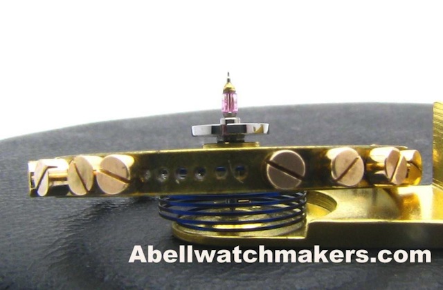 Patent Union Chronometer escapement, with a duplex ‚escape wheel locked by a pointed lever pallet system, acting on its short radial pointed teeth. The pallet system allows the ‘escape wheel to advance as in a Robin escapement, with alternating short and long drops. During the larger drops, impulse is transmitted to a pallet set in a roller on the balance staff, by the short upstanding triangular teeth on the band (rim) of the ‘escape wheel. Contact between the pallet system and the balance staff is made by a pointed ‘fork’ working with the duplex roller on the staff. The locking surfaces of the pallets have negative draw, so the fork is held in contact with the tubular shaped ruby roller, on one side or the other, except during impulse. There is a complex sliding pallet bridge arrangement , to optimise the critical depth between the pallets and the ‘escape wheel & depthing of the pallet fork release/engagement. As you can see a also a helical hairspring.