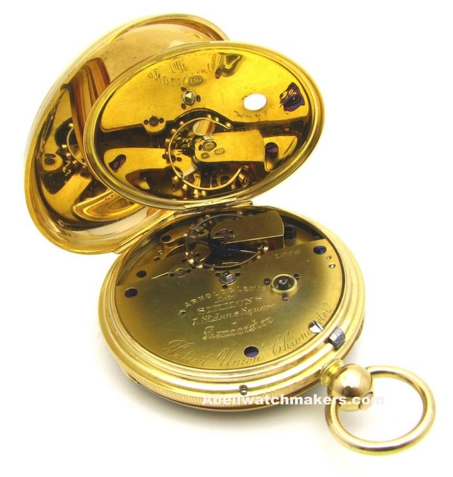 “The Patent Union Chronometer does have the merit that the escapement cannot unlock twice if the balance amplitude should increase beyond a turn in one direction. This is achieved without the balance being abruptly or violently brought to rest. Very few have survived in their original cases.
