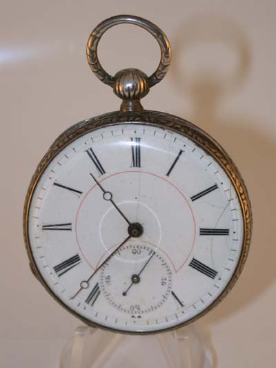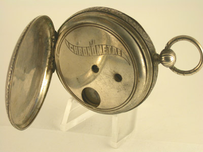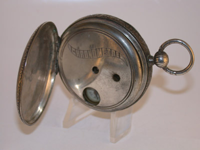 This silver cased pocket watch is about an 8 size and also has a skeletonized type movement that has no maker marks. What is unique about the movement is the compass set into the bridge plate. The movement cover is marked with letters MI and Chronometre.