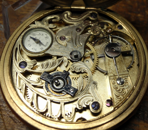 Swiss-made watch; low level cylinder escapement (4-6 jewels) upgraded by skeletonizing and the little compass made ca 1860.