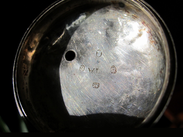 The case marks are the lion with the paw raised is for .925 silver, the lion's head with the crown is London, the lower case "u" is the date & if I am reading the chart correctly the date is 1795. The bust of a person is the duty mark showing tax on the item had been paid to the crown. Last the letters "IA" are the makers mark, so far I haven't found who that was.