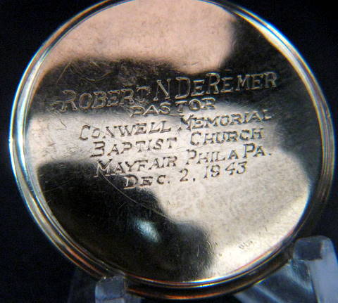 Ernie LogaThis is one of my latest acquisitions. It is serial number 4-125142 and was a presentation watch in 1943 to a Rev. Robert N. DeRemer. This provides some documentation that the serial numbers with hyphens were from the late 1030's and 1940's era.