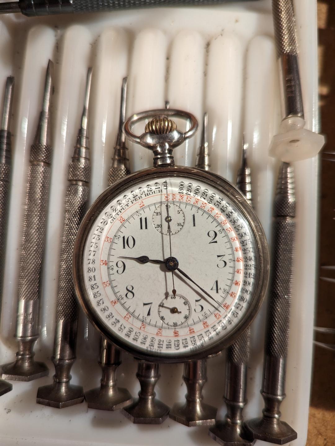 On the dial, above the 11 o'clock position, it says "OUTPUT PER HOUR" This suggests it was intended for use in a factory measuring how many products are being made per hour. It also suggests the watch was intended for an English speaking part of the world.