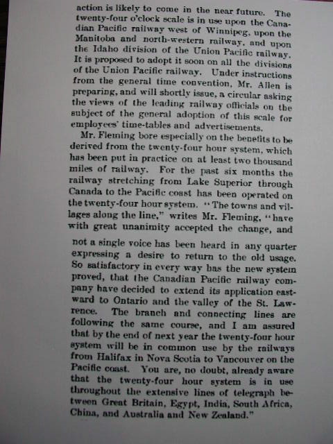 "and I am assured that by the end of next year the twenty four hour system will be in common use by the railways from Halifax in Nova Scotia to Vancouver on the Pacific Coast".