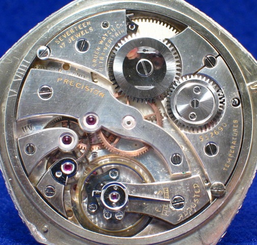 Lindell, your Gruen pentagon is beautiful, and the condition is awesome! Currently I am dedicating myself to building a database for the in house Gruen pocket watchees (before they outsourced their production in the 1930s to unknown Swiss maker). With the help of another NAWCC member that kept an archive of Gruen watches he's seen or worked on throughout the years, so far I have around 500 specimens in my DB spread amongst all grades. Therefore, any contribution to my DB will be greatly appreciated (everyone submitting info is referenced). Lindell, your example should have a V2.5 19j escape jewel capped movement inside, either with or without 'Precision' marking. It'll be even better if you can show some more pics for it. I'll try to post some of the other Gruens I own when I modify the pictures, so stay tuned!
