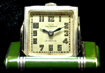 I don't know whether Sandoz sold cases. I know next to nothing about Sandoz. I don't collect Sandoz watches, except for a modest collection of the Tavannes La Captive model and the similar Cyma model. Tavannes and Cyma were or are Sandoz brands. My little collection consists of 1. A silver example, signed "Cyma" 2. A silver and onyx example, signed "Tavannes La Captive" 3. A green-enameled silver "Tavannes La Captive"-signed example, shown below 4. A silver Dunhill PL exanple, signed "Chronometre Tavannes" None of these watches have the arm-and-hammer stamping of your watch. ![]() | |||