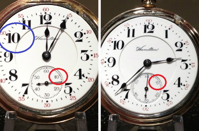 We talked at the beginning of this post about the upside down 30 on the earliy Hamilton dials. I recently found a 1910, 992 (7693xx) that I was considering making an offer on and I noticed the 30 was right side up like the later movements. (I kinda thought a Hamilton 4 foot replacement dial?) As I am almost sure I have seen dials from a later date with the 30 still upside down. Do you have any idea when they turned the 30 right side up?