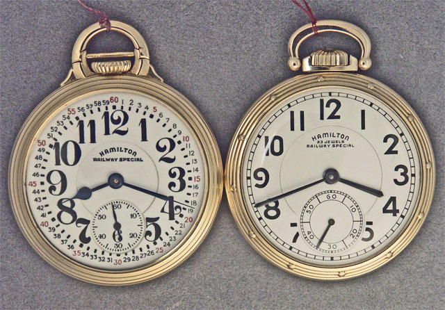 Pictured are two Hamilton watches--a 992-B (left) and a 950-B (right). Now they both have differences of: case models, dials, hands and, obviously, the movements inside. So what could these two very popular Hamilton railroad watches share in common?