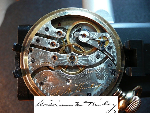 The mans signature that appears on your watch was the 25th president of the United States. Although his signature looks like Wm Kirely it's W McKinley. The president had no middle name. Here's some info.