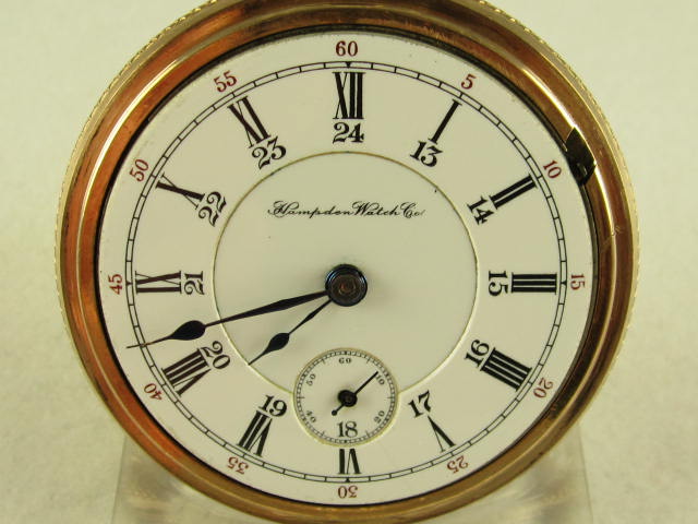 Here's an 18 size Hampden pocket watch with nickel gold lettered adjusted movement marked "The Dueber Watch Co.," stem wind and lever set with serial number 1382583 circa 1900.