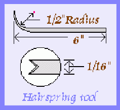I made my own tool for removing hairsprings using the example in "Fried`s Manual". His was a dual tool with a curved fork-like (crow bar) on one end and a small flat straight tip on the other. I already had a flat-tip tool that I made from a sewing needle so I used a small plastic handled screwdriver to make my curved fork tool. I filed down the end, bent the end into a quarter-circle using a hammer over a steel rod (about 1" dia.). Then used a triangular file on the groove. See drawing below (the dimensions are Frieds) The width of the tip on mine is more like 3/32" but I work mostly with 16-18s hairsprings. Also my total length is closer to 4-1/2". He suggests tempering the end by heating till red-hot then plunging into water or oil. Then the end is carefully polished (it is very hard and brittle at this point). Then to re-heat until the color goes from straw to wine. As it reaches the wine shade immediately plunge into the water. This will temper it down so it is still very tough but not so brittle. Make sure it is polished smooth. If there are any burrs they will catch on the spring.