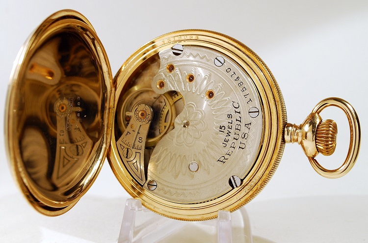 Eric UnseltLike the Edgemere line, the Republic was available in the open-face and hunter Models 12 and 13, respectively, and could be had in a variety of jewel counts, patterns, and the choice between straight nickel and two-tone.