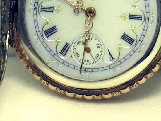 We bought the watch in England about twenty years ago. The movement which runs like a top is a 6s, 15J Elgin with a mint condition fancy dial. The magnificent multi colored, COIN based case with applied gold was made by C.W.C.Co. I'm not quite sure what the gold central section of the watch is made of since I've never had it tested.