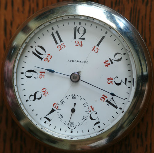 Very nice Hamilton 21J 18 size, #940, Serial No. 413605 private label from W.F. Tate & Sons, Cranbrook with doulble sunk 24 hour dial. Your double sunk Elgin from Robert McDonald, Vancouver B.C. is interesting only having a 12 hour dial, may be used for inter-urban servers in Vancouver. Nice Elgin finger bridge movement Serial No. 20370799.Elgin site shows as Grade 382 manufactured circa 1917.interesting single sunk 24-hour dial marked Jackson Bros Edmonton, Alta. Tim at the time this Elgin was manufactured in 1894 Edmonton was part of the North West Territories (N.W.T.) As you can see in some of my earlier posts Alberta and Saskatchewan became provinces in 1905 so the dial is much later than the movement. All in all you have a very nice collection of early Western Canadian private labels, I especially like your Hamilton. nice commemorative of Athabasca dial on your Seth Thomas movement.