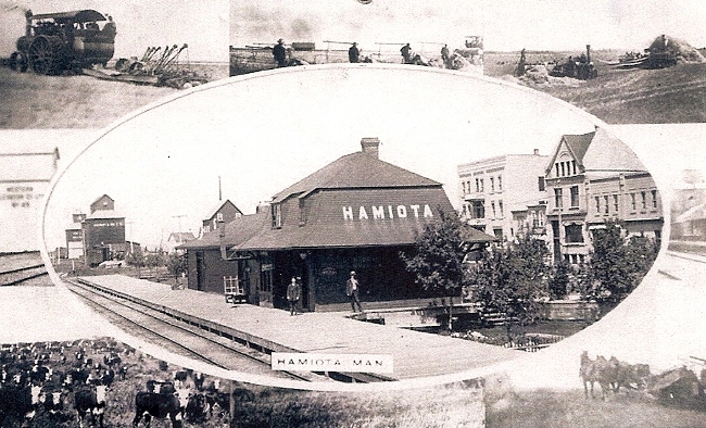 Larry BuchanHamiota, Manitoba is located on the CPR branch line built from Brandon to Arrow Lake, Manitoba in 1883, known originally as the rural municipality of Oak River, it was renamed on June 28, 1895 to avoid confusion with the rural municipality of Ochre River. Hamiota Pioneer Club Museum situated in the Municipal Park on the East side of 7th Street South. They have acquired the former MacConnell CN railway station built in 1909 on the Halboro-Beulah branch of the railway, you can see MacConnell on the Western Lines Railway map. It is on the CN blueline above Hamiota source of information Local History Book Hamiota: Grains of the Century. Postcard view of CPR Hamiota railway station vignette with harvesting and threshing seems along the top border, buildings on the side, and cattle and horses along the bottom, courtesy of Ken H Smith, President Hamiot and District Archives, and Hamiota Pioneer Club Museum.