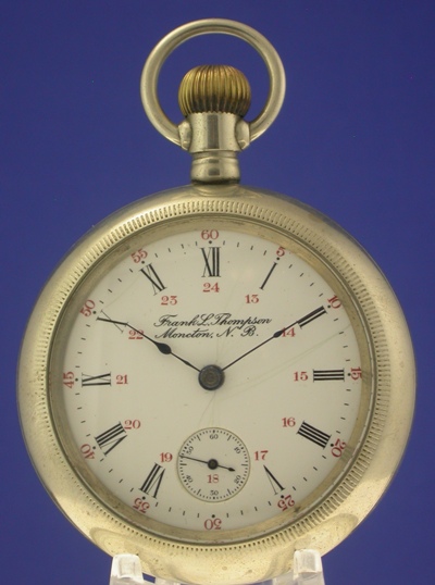 Going to the Eastern provinces another Rockford, 18 size, 17 jewel, Grade 935, private-label single sunk Roman numeral in black 24 hour red inner tract marked "Fred L Thompson, Moncton, N.B.," ![]() | |||
