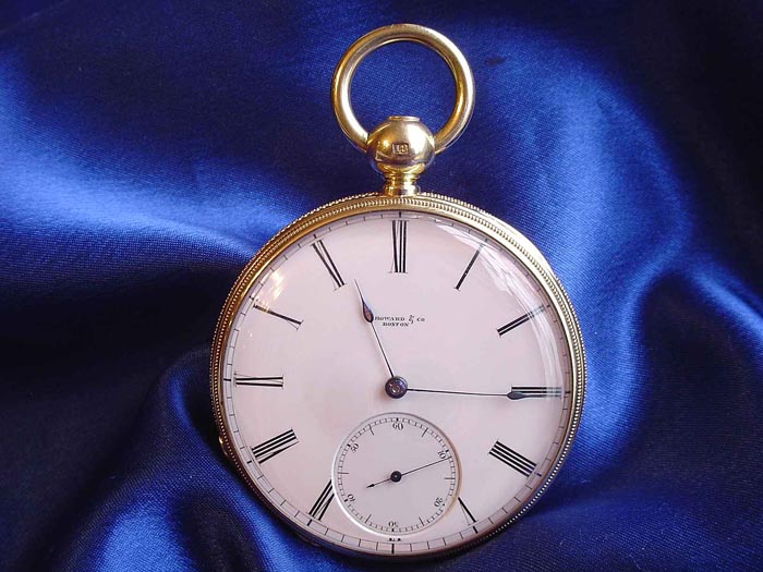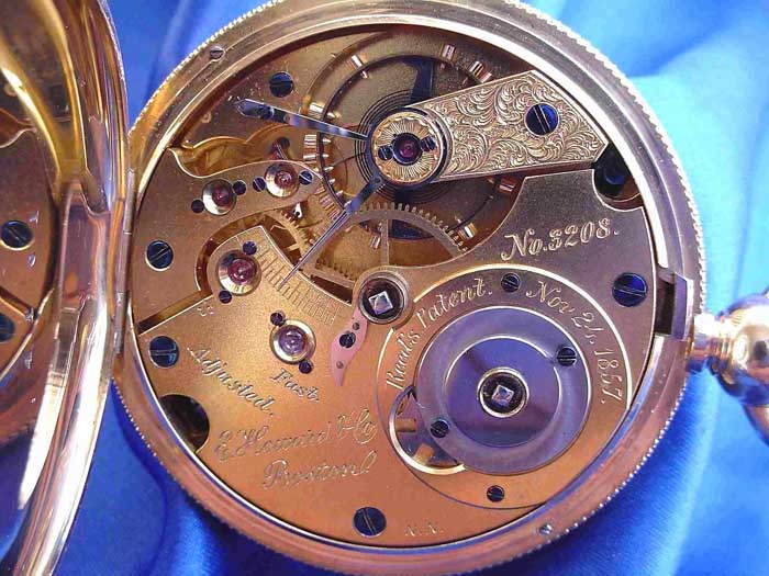 First, unlike other American manufacturers, Howard did not name his watch models. They were all engraved simply "E. Howard & Co." (The two exceptions to this statement, the Prescott and Eustis models both made in the late 1870's to early 1880's, were of lesser quality than Howard's standard production. [The Prescotts were reworked, former Cole's escapement movements of dubious quality, and the Eustis was an attempt at economical production that featured a standard going barrel in place of Howard's more expensive safety barrel]. Thus the intent of these model names was to distance the Howard name, to some degree, from the products on which they appeared. Contrarily, S# 3,208 is clearly one of Howard's premium products.)