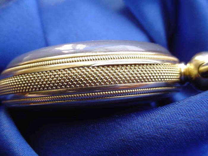 I believe that this is the second (to 3202) watch in the USA market to have used an experimental Breguet overcoil hairspring; there is also an interesting hanging banking pin arrangement as shown in the photographs below. The plate is marked “Adjusted” and Reeds Patent. The inscription in the inside shows that it was presented on Dec. 25, 1862.