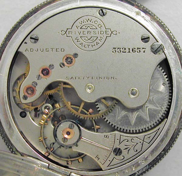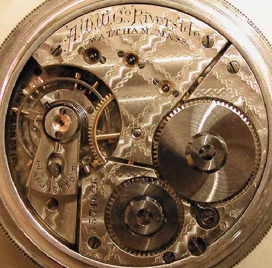 Jerry Treiman... and here is the 1908 model with the Ohlson's regulator and 19 jewels. Note that both have the chain pattern on the winding wheels, typical of this grade. The damasceening, however, is a simpler broad circular pattern. The lever-set open-face Riversides were railroad grade.