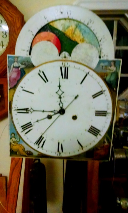 Finished cleaning and doing some minor repairs on this clock (new cables, straighten pendulum rod and suspension spring, straighten second hand arbor, straighten arbor third wheel strike side, straighten escapement wheel arbor, remove numerous finger prints, and clean up battered screw slots) and thought people might find it interesting. The false plate is by Walker and Hughes, Birmingham, but the dial is labeled David Gottleib, Hanover. The clock was donated to the Union MIlls (Carroll County, Maryland) Homestead, in 1975 by someone who stated it had been in their family since new. The Union Mills Homestead Museum Director believed the clock to date to 1800, but Walker and Hughes were only in business from 1810 to 1825, so the clock cannot be older than 1810. David Gottleib was a clock maker working in Hanover, PA from about 1800 to 1850. The unusual feature of this clock is that it has a center seconds hand and a center calendar hand. The calendar is actuated by the back side of the roller moon dial actuator, driven off the hour pinion. Here is a photo of it, on my test stand. The replacement cables are not tied off yet, because I forgot to measure the case. When I replace the movement in the case (sometime next week) I will tie off the cables so that the weights are always under tension, even when the clock is fully run down. (That is the only way to keep them from tangling on the barrels.)