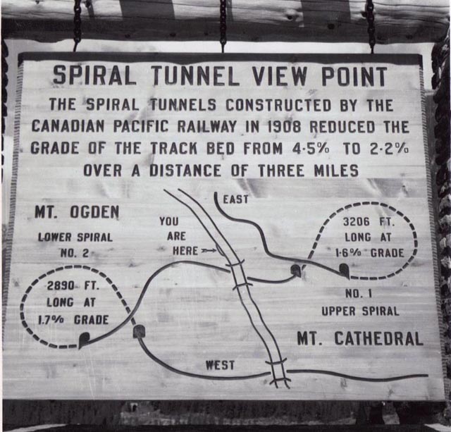 Well I've got my old trusty Hamilton wound up, and it's time for another tale from the rails. When the Canadian Pacific Railway was being completed in 1883 they were in financial difficulty. The route on the west side of the Continental divide proposed a great problem with its steep grades. In order to save money a temporary line was built with grades of 4.4% this was called the Big Hill it ran from Stephen at the Continental divide to the railway community of Field a distance of 7 miles. Field was named after Cyrus W. Field a Chicago businessman who built the Transatlantic cable, and who the CPR hoped would become an investor in the company. Standard locomotives were 4-4-0s but were of little use on the big hill Baldwin Locomotive Works were called upon to build 2-8-0s for use as Field pusher engines in 1884, at the time they were the most powerful locomotives built. The CPR began building its own 2-8-0s in August 1897. The big hill which was supposed to be temporary was to remain the main line for 25 years until the Spiral Tunnels were opened on September 1, 1909. The project was started in 1907, the route was decided upon and two tunnels were driven and three quarters circles into the valley walls the upper tunnel No. 1 ran under Cathedral Mountain emerging 50 feet below itself. Descending the valley side after its three quarter turn the track crossed the Kicking Horse River and entered Mount Ogden, the lower tunnel No.2 was shorter than No.1 by a few feet and the descent was again about fifty feet this route doubled the length of the climb and reduce the ruling grade from 4.4% to 2.2%. The labor force involved a thousand men, and cost 1.5 million Canadian dollars.