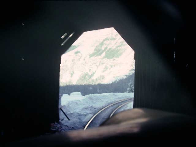 Larry BuchanHere is a view of the East portal of Spiral Tunnel No. 2 that I took in the summer of 1979, notice the additional oil covered rail that ends just outside the tunnel portal and is fastened between the two rails. This is called a Jordan rail, and is used as a safety measure in the event of the derailment inside of the tunnel, the idea being that the derailed wheels will butt up against the Jordan rail and the cars would not strike the walls of the tunnel. Double Jordan rails are also use on railway trestles to minimize damage to the structures.