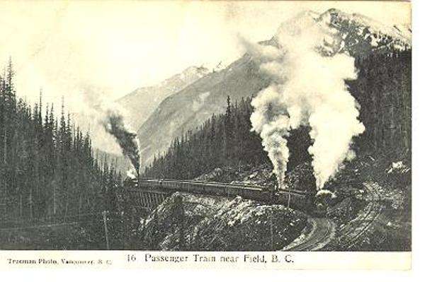 Larry BuchanA postcard view showing an eastbound passenger train with pusher engines climbing Field hill in the early 1900's before the Spiral Tunnels were built, the grades from the summit of the Continental divide at Stephen down to Field, British Columbia were 4.5% the steepest on the CPR system, visible on the right-hand side is one of three safety switches that were installed on "The Big Hill" as a safety measure for westbound trains descending, switchtenders were stationed 24 hours a day at these locations and switches were always lined for the runaway track, the locomotive engineers on westbound trains had to whistle to notify the switchtender that their train was under control before he would line the switch for the descending grade, in spite of these safety measures there were still many runaways and derailments, and eastbound trains were limited in the amount of tonnage they could carry, and many crews and steam locomotives were needed for pusher service out of Field.