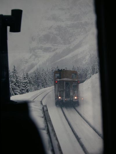 Larry BuchanLeaving Cathedral cabooses pass each other, Train crews exchange signals saying all is okay with the westbound.