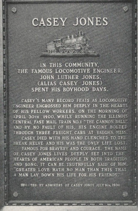 Dedication on Casey Jones Headstone In This Community, The Famous Locomotive Engineers, Jonathan Luther Jones. (Alias Casey Jones) Spent His Boyhood Days Casey’s Many Record Feats As Locomotive Engineer Engrossed Him Deeply In The Hearts Of His Fellow Workers, on the Morning of April 30 Break sic Helve sic (Should be Brake Valve) And His Was the Only Life Lost. Famous For Bravery And Courage. The Name Of Casey Jones Lives Deeply Set Into The Hearts Of His Fellow Workers, On The Morning Of April 30th, 1900, While Running the Illinois Central Fast Mail Train No.1 “The Cannon Ball” And By No Fault Of His Bolted Through Three Freight Cars At Vaughan, Mississippi Casey Died With His Hand Clenched To The Break sic Helve sic (Should be Brake Valve) And His Was The Only Life Lost. Famous For Bravery And Courage. The Name Of Casey Jones Lives Deeply Set Into The Hearts Of American People In Both Tradition And Song. It Can Be Truthfully Said of Him. “Greater Love Hath No Man Than This That A Man Lay Down His Life For His Friend” Erected By Admirers Of Casey Jones July 9th, 1938 ![]() | |||