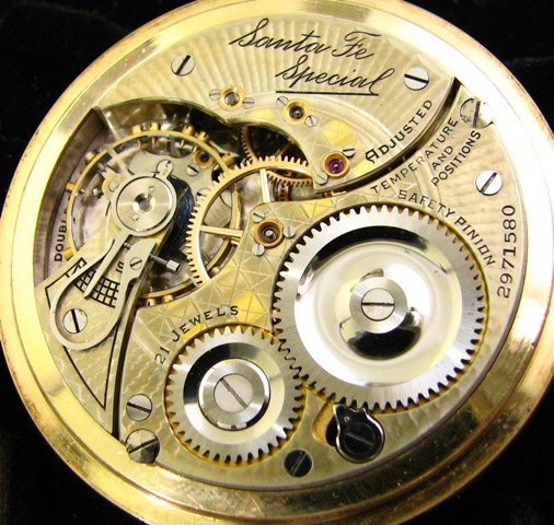 John J. Flahive IIINext is a 16s Santa Fe Special open face watch Grade 806 with 21 jewels. The DMK is sort of in a checkerboard diamond pattern. Serial number is 2971580. This is the first pocket watch I ever bought, and I picked it up in our Member's Only auction area.