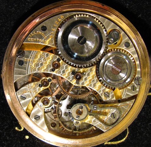This 12s watch has wavy 2-tone stripes in the center. It is marked "Illinois Central", and it is a 17J, Grade 404. Serial number is 3141246.
