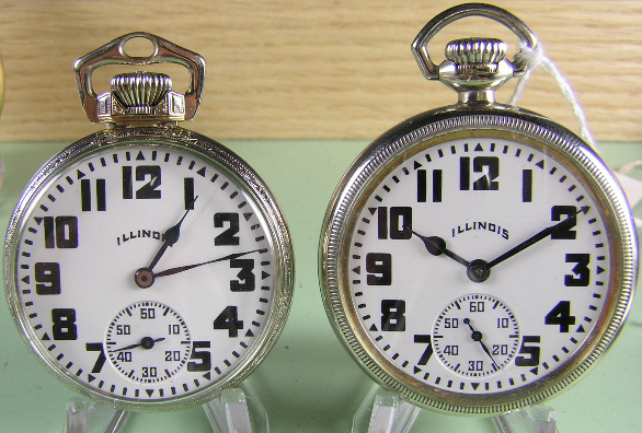 Steve MiddlesworthNow then, here are two 16 size, 19 Jewel, Bunn 60 Hour (1925-1926 production) with idetical dials with the exception of the Illinois hallmark. The one on the left was my Grandfathers watch a Type I, which we had awhile back discussed as a watch which had been recased and an upgraded dial conversion. I have since bought 3 of these movements with the same dial on them. The watch on the right is the most recent acquisition and it is a Type II. I also have a Type III coming with the same dial on it.