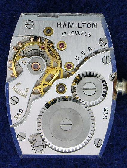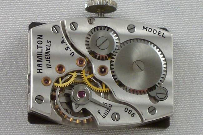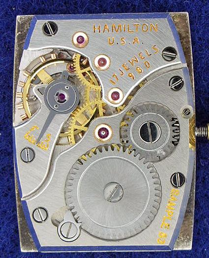 René RondeauThe Hamilton 982 movement was almost the top of the line for wristwatch movements at the time. It was essentially the same as the workhorse 980, but with two additional jewels (caps on the escape wheel) and a finer finish. The only thing better was the 982M, or 'Medallion'. This was essentially identical to a 982 but was finished and adjusted to a finer degree than the regular 982.