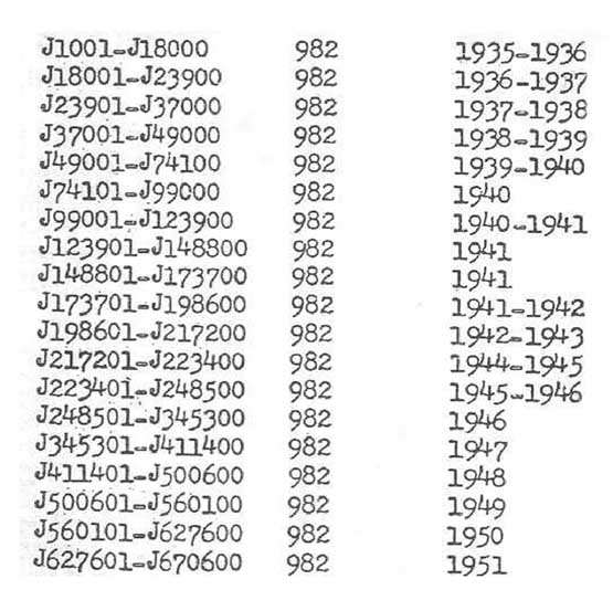 Looks like Grade 982 began at J1001 in 1935 and continued through 1951 production. That would indicate your number J2320 would have been the 1,320th of the Grade 982 originally blocked for production. But I would caution these are merely blocked numbers set aside for production runs.