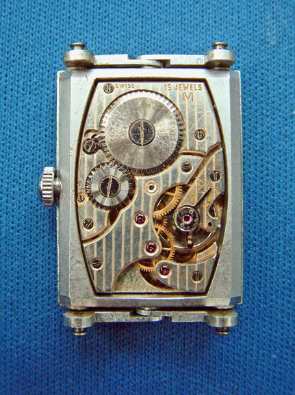 Dan MitchellAnd here is the 15J movement. Also shown are the sets of hinged arms on which the watch section turns, and the ends of the four arms showing the studs which move in two grooves in the outer case.