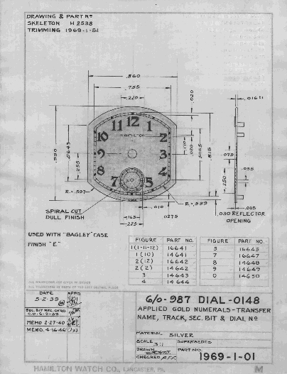 I have posted a Bagley applied gold numeral (no. 0148) blueprint below for review. As you can see, the number "0148" is posted on the bottom of the dial just as it is with Samie's (no. 0149) Black Transfer Numeral Dial. Interestingly, the Endicott Dials which contain earlier reference numbers than the Medwick and the Bagley (beginning with no. 0143 and going to no. 0145 [and yet another Endicott reference no. 0152 Gold Inlaid Roman Numeral Dial] ) do not contain the reference number on the dial face. The lack of dial reference numbers printed on the face of Hamilton dials pre-Medwick and there being none post-Bagley indicates to me that the practice was short lived indeed - only two model examples.