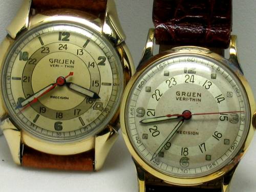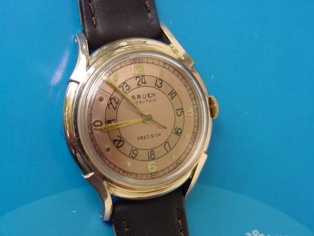 here is a nice Gruen with a 14k rose gold case and a 2 tone 24 hour dial..I now own 2 Gruens with the 24 hour 2 tone dials this one and a gold filled one..