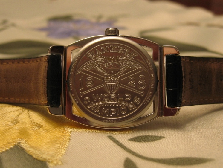 Here is the one I have on today -- the early '90s Piping Rock reissue with the reproduction of the 1928 Yankees engraving on the back of the case. This one is the 17J manual wind version, which is much less common than those with the quartz movement.