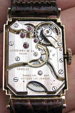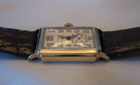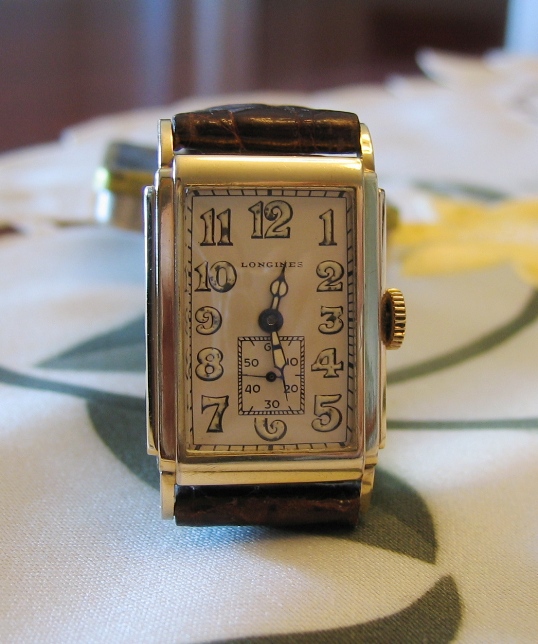 Here's one of my newer acquisitions, worn today: a ca.1930 Longines tank in yellow gf (marked 10K rolled gold plate on the reverse of the case). Bryan G. told me he believes this case is pretty much identical in shape to that used for the contemporaneous Hamilton Andrews. The dial appears to be original, with only slight wear to the luminous.