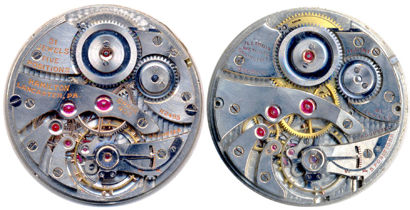 Jerry TreimanDan - the Hamilton grade 400 pocketwatch was not an original Hamilton product. When Hamilton purchased Illinois they recognized the appeal of Illinois' extra-thin model such as the "Illini". They converted the Illinois design and assigned it the Hamilton grade 400. This picture shows a grade 400 movement with the serial number H2485 visible on top. Under the dial it carries the number 5402485. The right hand movement shows the Illinois grade that was part of the basis for the Hamilton movement. Although this Illinois is a grade 538 rather than the slightly smaller 528, I show it because it has the unusual application of the whiplash regulator that was not used on most of the Illini movements.