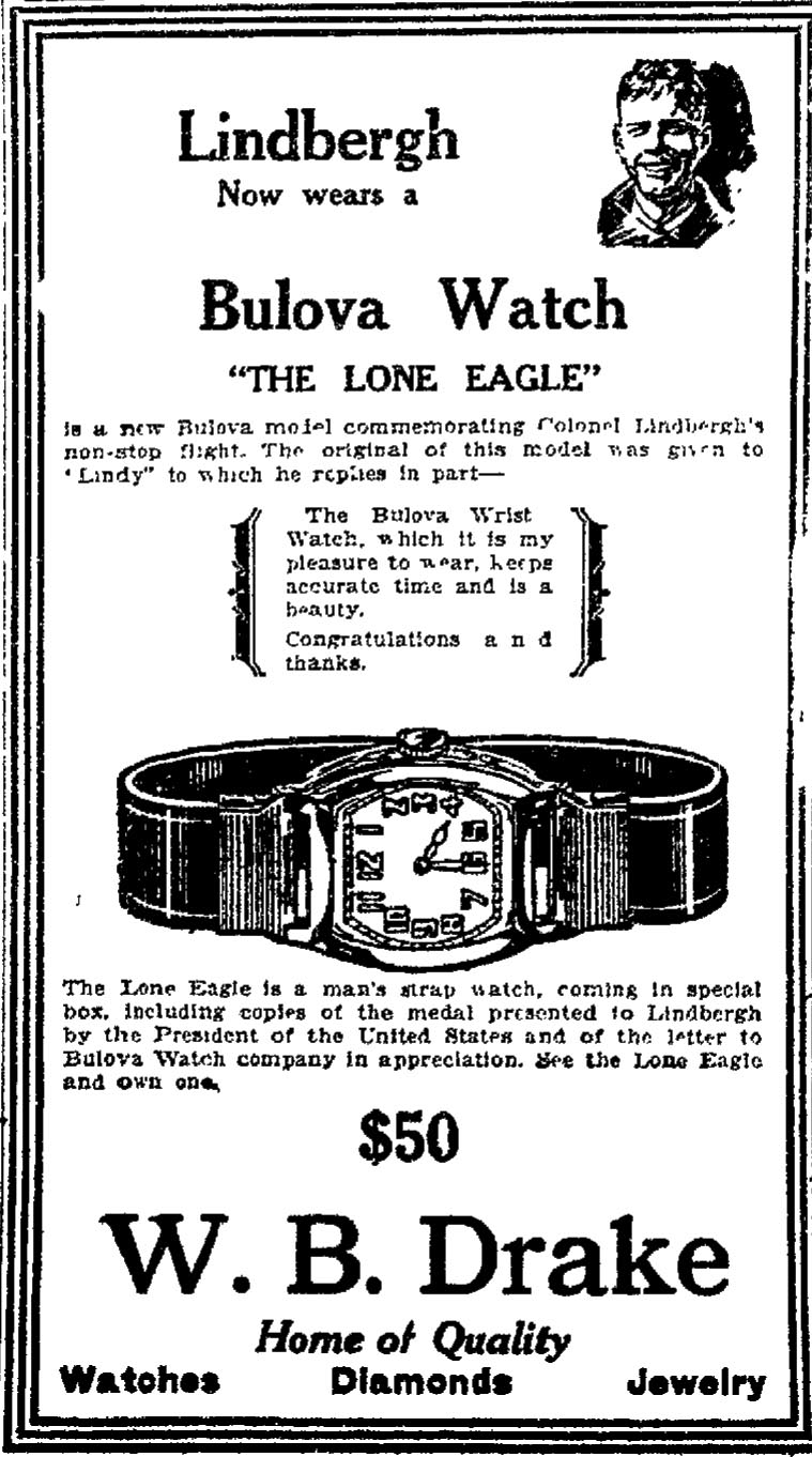 The watch shown in the last ad (without any markings) doesn't look much like any of the Lone Eagle series of watches and doesn't even have any Bulova markings, so I wonder if the jeweler for this ad 'W.B.Drake' took some liberties in advertising fake Lone Eagles or is the drawing just a real bad version of the Series II Tonneau Lone Eagle. I think maybe the latter as the ad also mentions the letter and box that I have seen.