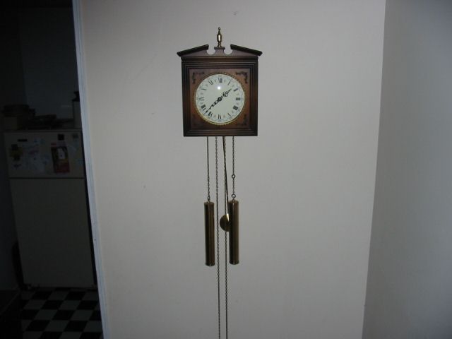 The german clock with the brass weights is nice.I also like my advertising clock and the choo choo clock beside it.