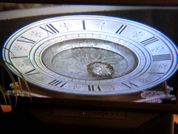 As you'll see in the first picture the table top styled clock sits with it's concave shaped dial facing upwards. The dial contains water, and the single metallic, floating time marker is shaped like a turtle. The clock apparently has a rotating magnet underneath the dial which is powered by an antique French clock movement. The turtle appears to obtain it's motion from this sub dial magnet. The turtle moves around the circumference of the dial and completes one full revolution every twelve hours. I would guess the concept is based on either a sundial principle or an ancient Chinese water clock. It certainly is an extremely interesting timepiece.