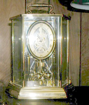 John ArrowoodLast and definitely least, my own presentation clock. Seth Thomas quartz Westminster chime. Presented for 25 years service at the Oak Ridge Gaseous Plant. I missed an Atmos by 4-6 years. Uniion Carbide Nuclear Division gave Atmos clocks for 25-year service awards, but their contract was not renewed by Dept. of Energy and the later contractors have not been overly generous.