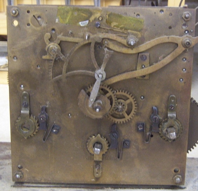 John ArrowoodHow many strike hammers are there, one on each side or a different arrangement? Since it appears to have three trains one of them must drive a quarter strike of some sort. The ratchet wheels, their retainers, the clicks, and the click springs look French, but the spring loaded pin on the rack where it rests against the snail and the motion work wheels don't look like French work. That post just below the rack with a bent pin through it looks strange, does it protrude from the plate far enough to be the arbor for a second gathering pallet?