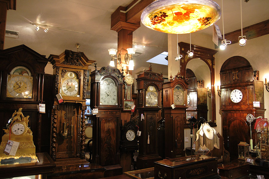 I'm not usually over here in the clock area but there is something I want to share. We just spent a short weekend in Santa Barbara and on the way home we stopped off in the town of Solvang where I discovered the most amazing collective of clocks and watches ever! They also stocked a good variety of other really expensive stuff too such as paintings, music boxes, pianos, estate jewelry, candelabras & chandeliers, toys, antique scales and even an antique meat slicer! Anyway I was quite amazed and the nice staff invited me to take as many photographs as I liked so here a few are. Also, here is a link to their website with the entire inventory cataloged: