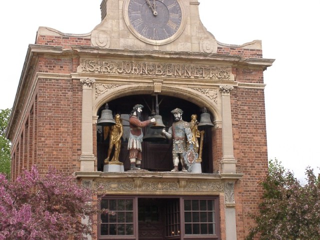 Tom SeymourWhile they do look like they could be hoisting a pint in honor of..... they are actually as Mark described, and vent their frustration at not having a pint in hand, by banging on the bells each quarter hour.