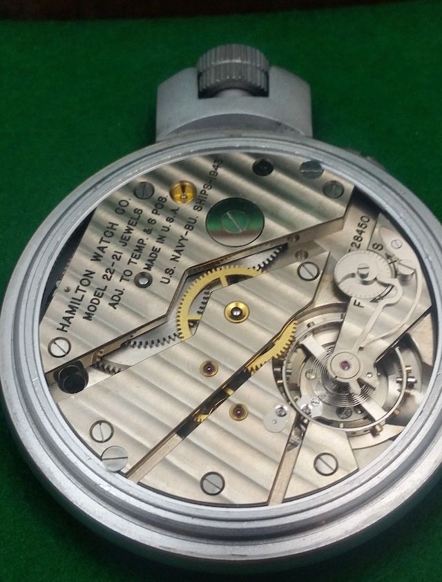 I just bought a Hamilton Model 22 in wooden case (interior and exterior cases intact). It could best be described as NOS - it was purchased by a jeweler in WI direct from Hamilton after the war and he never sold it. Acquired from his estate intact, and I just bought it. It is literally like new. The wood is barely scratched. The leather strap is in great condition. There are no marks on the case, crystal or movement. It even has the original shipping carton it came in from Hamilton! Keeps time to less than a second a day.