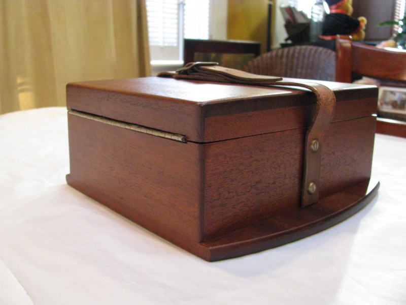 The box lid appeared to have been previously stripped of all old varnish and lacquer. I used “Zinsser” Furniture Refinisher to gently remove the lacquer and varnish from the bottom box to match the pair. This process takes some time and several applications as there is no scraping involved, just #0000 fine steel wool and a gentle cloth wipe. Then a “MinWax” “Red Mahogany” stain was applied to match the original color. Interesting note: There was the number 569 written on the inner lid and bottom box under where the pads were.