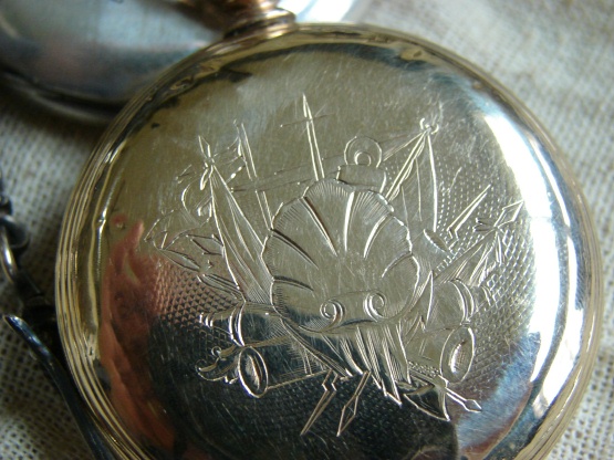 Greg CrockettUnlike the last two watches, the engraving on this watch is nationality neutral. Within this navy coat of arms it’s possible to see angular socket bayonets, a boarding axe, spears, flags, an anchor, cannon, masts and so forth. This watch has a gold hunting case and a Swiss bar movement. The covet is marked: Patent Lever Full Jeweled Arnold Adams & Co. London.